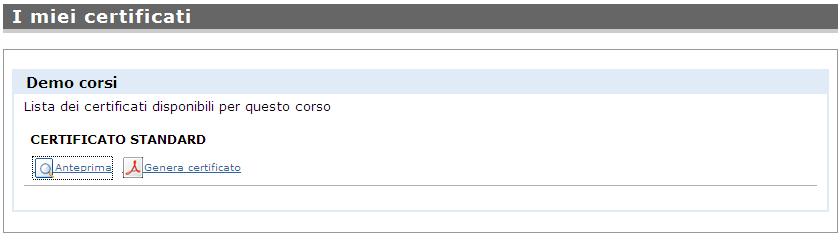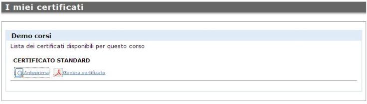 Lato utente, quando uno studente iscritto raggiunge nel corso lo stato previsto per l’emissione del certificato, andando nel menu “la mia area” – “i miei certificati” trova il link per vederlo in anteprima (la scritta “facsimile” viene aggiunta automaticamente al certificato) e per generare il certificato (potrà scaricarlo in pdf).