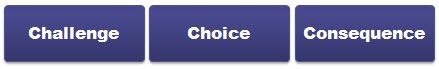 Mi piacciono le cose semplici. Quindi uso il modello che chiamo 3C. Ogni scenario consiste di un challenge (sfida), alcune choices (scelte), e poi le consequences (conseguenze) di quelle scelte.