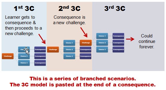 Quindi nell’esempio sopra, state presentando una sfida all’utente. L’utente prende una decisione e seleziona la scelta appropriata. La scelta produce conseguenze. A questo punto, potete dare un feedback e far continuare l’utente. Oppure potete aggiungere un’altra struttura 3C alla fine delle conseguenza. Finireste con qualcosa di simile all’immagine sotto.