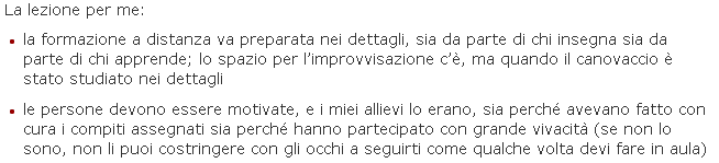 L’articolo di Luisa tocca solo il tema della formazione a distanza tramite aula virtuale, che è sincrona (tutti devono essere presenti nello stesso momento) e quindi si differenzia dalle altre metodologie tipiche dell’e-learning (che sono asincrone e consentono all’utente di formarsi quando gli fa più comodo). Le “lezioni” che secondo l’articolo si possono trarre sono queste: