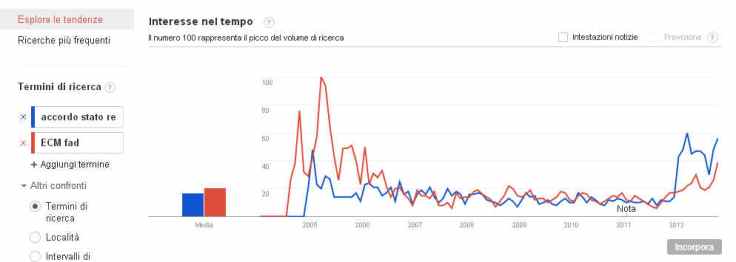 Come si può facilmente vedere, sia accordo stato-regioni che ECM sono temi che erano molto cercati nel 2005-2006. Le ricerche sono poi calate, e sono tornate ad avere volumi elevati nell’ultimo anno. Naturalmente, nel caso dell’ECM il motivo è il fatto che via via si è passati da un sistema sperimentale a un sistema con una legislazione che – sia pur ancora confusa in alcuni aspetti – almeno è diventata nazionale e stabile. L‘accordo stato-regioni invece è un argomento hot a partire dalla fine del 2011, come già abbiamo raccontato diverse volte.
