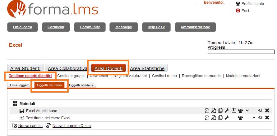 Per la configurazione del materiale, cliccare sulla voce di menù “Area Docenti/Gestione Oggetti didattici/Oggetti del corso” (Fig.2)