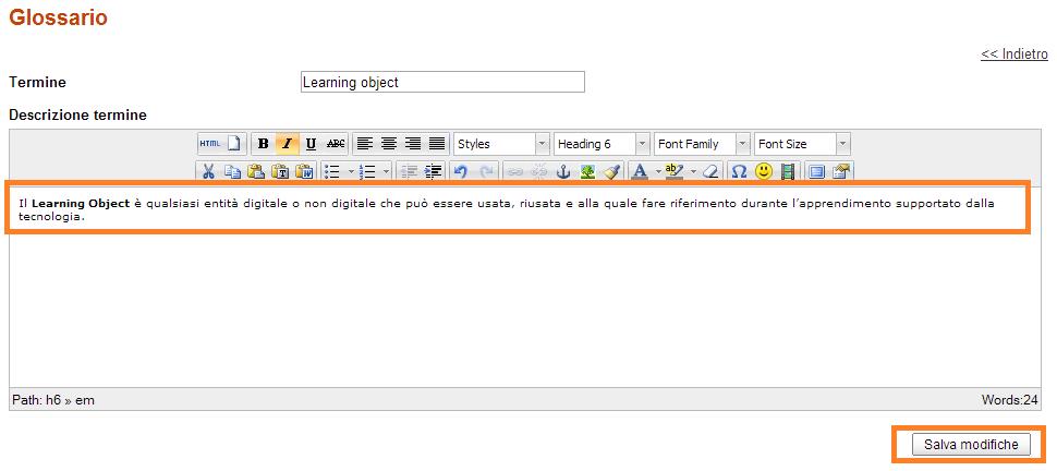 Mettiamo il caso, che decidiamo di cambiare la definizione di Learning Object, basterà semplicemente cancellare la definizione precedentemente inserita e scrivere quella corretta. Ricordarsi di cliccare sul pulsante “Salva modifiche”. (Fig. 9)