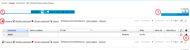 - Eliminare l’iscrizione di un utente a un corso (icona “X” rossa)