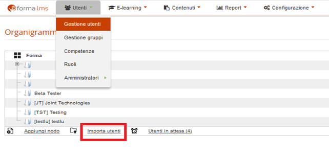 Una volta creato il file andiamo in Amministrazione//Utenti/Gestione utenti e clicchiamo su “Importa utenti”. Fig. 4