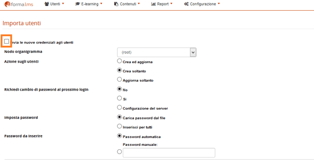 - scegliere se vogliamo richiedere il cambio password al login dell’utente e se la password verrà presa dal file oppure generata automaticamente