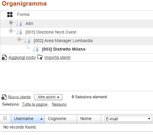 Oggi ci soffermeremo sulla descrizione passo per passo della procedura di “creazione dell’utenza” manuale. E’ infatti possibile anche importare gli utenti tramite file csv, per iscrizioni massive. Prendiamo come esempio, la creazione dell’utente ‘Mario Rossi’ nell’organigramma “Distretto Milano” che si trova nella seguente posizione dell’organigramma: Direzione Nord/Ovest -> Area Manager Lombardia -> Distretto Milano