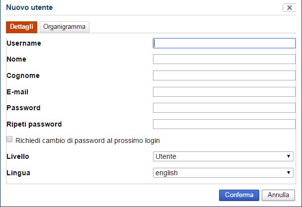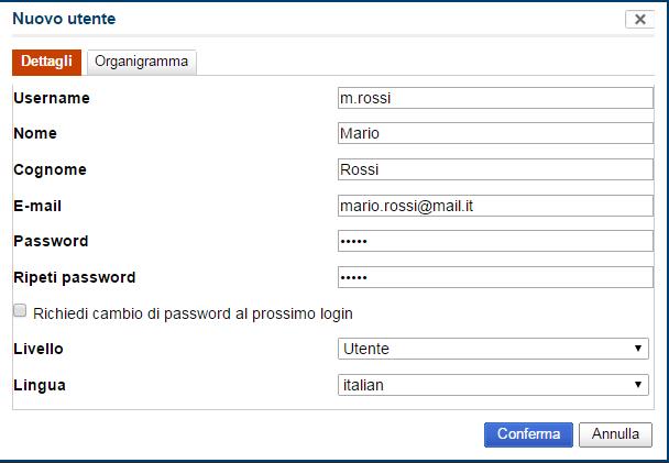 A questo punto è possibile inserire i dati dell’utente riempiendo i campi richiesti (Fig.4), dopodiché cliccare sul tasto “Conferma”. Tramite il tab “Organigramma” è possibile modificare l’organigramma di appartenenza dell’utente che si sta creando.