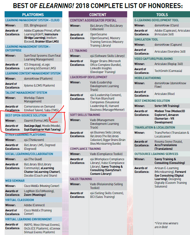 E alla fine, anche quest’anno, Forma LMS si è di nuovo classificata prima tra le “migliori soluzioni Open Source” del concorso Best of Elearning!