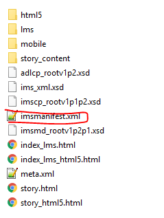 Occorre individuare il file manifest nella cartella in cui abbiamo pubblicato il corso. L’esempio sotto è la tipica cartella di output di uno scorm realizzato con Storyline