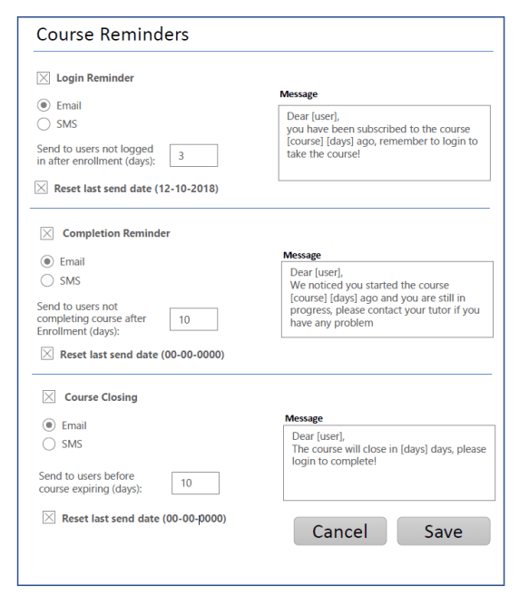 - Promemoria di chiusura: l’utente non ha completato il corso X giorni prima della data di fine del corso (se impostata).