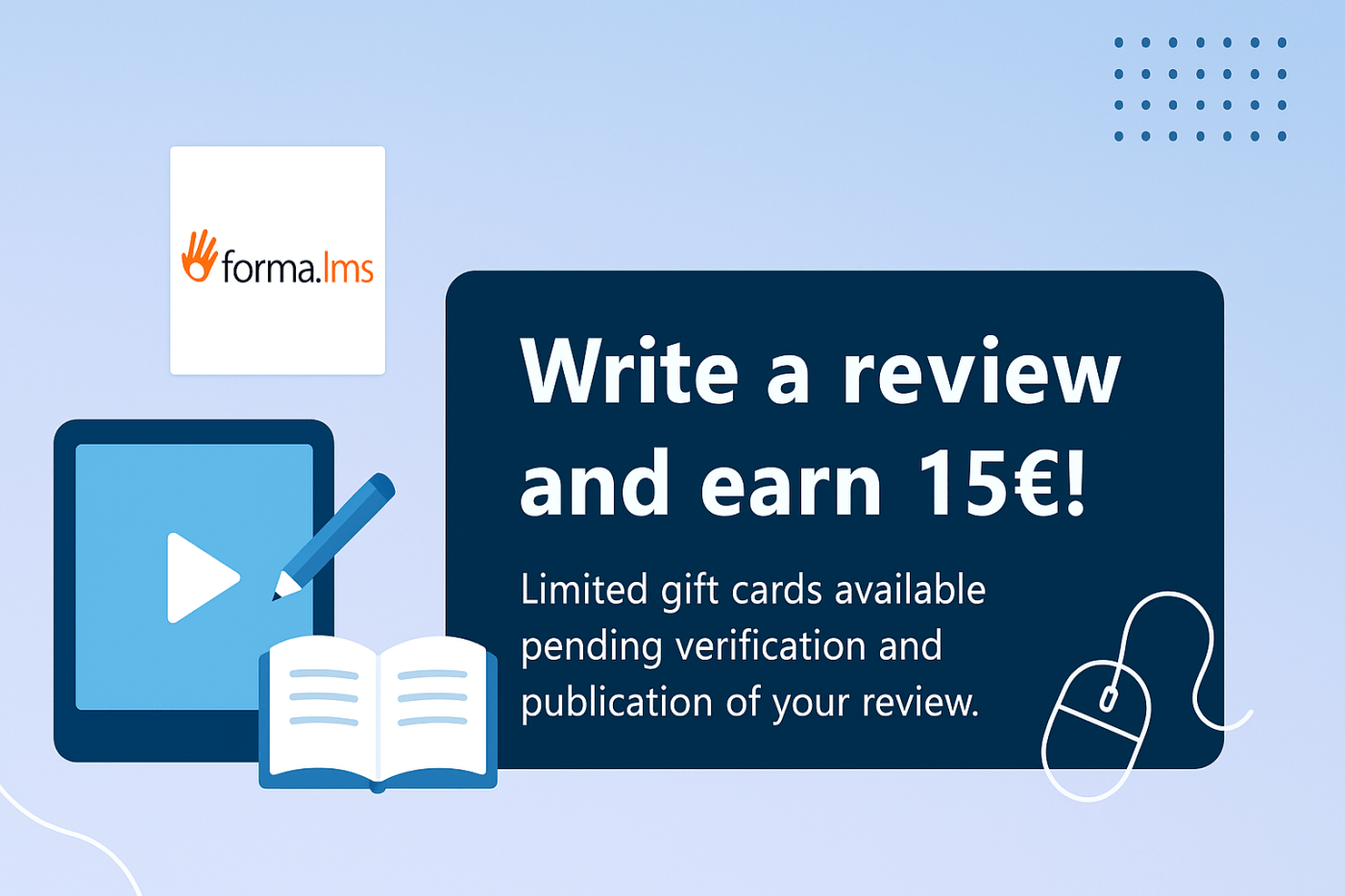 Se ancora non hai raccontato la tua esperienza con Forma, questo è il momento adatto per farlo! Scrivi una breve recensione su Forma LMS e riceverai una gift card da €15. Il budget è offerto da Capterra ed è limitato, quindi ti consigliamo di partecipare subito!