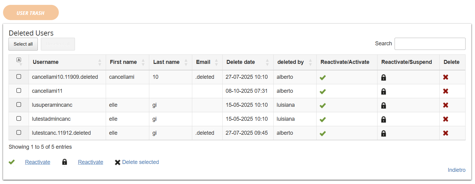 Il cestino degli utenti eliminati sarà accessibile con lo stesso link che mostrava il log degli utenti cancellati, ma mostrerà un elenco editabile basato sul nuovo componente “user selector”: