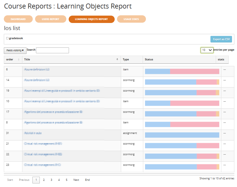 - Integrazione funzionale: tutti i materiali didatti sono sono automaticamente inclusi nei report e hanno tutti la stessa modalità di visualizzazione e gestione dei tracciamenti, inclusi il learning object “Attività” (oggi funzione specifica del gradebook), i questionari (i cui risultati oggi sono inclusi nelle statistiche per LO) e gli oggetti scorm (che oggi vanno aggiunti manualmente al registro.