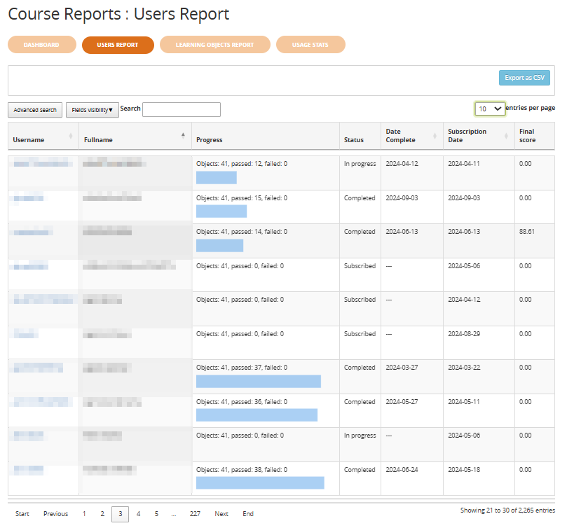 Ecco il modulo “Report del corso”, che ti permette di avere in un’unica interfaccia tutti i dati di tracciamento degli utenti del corso.