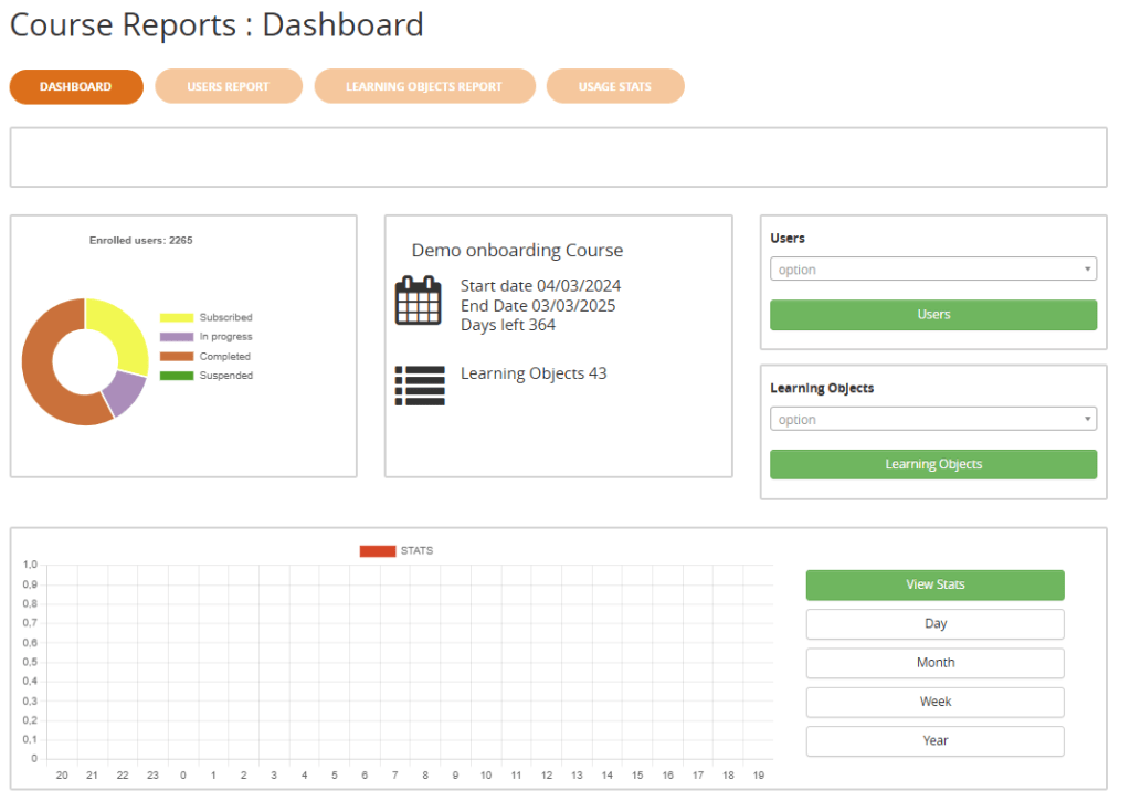 Una nuova visualizzazione a “Dashboard” fornisce una intuitiva vista d’insieme sull’andamento del vostro corso, e integra due comodissimi form di ricerca che vi consentiranno di trovare al volo le infomrazioni su un utente o un learning object specifico